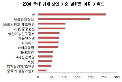 연구소를 운영하고 있는 국내기업들은 2030년까지 경제·산업·기술 분야에서 변화를 몰고 올 주요 요인으로 인공지능(AI)과 3D프린팅. 남북 경제협력을 꼽은 것으로 나타났다. 표, 그래프: <2030 국내 경제·산업 기술 변화를 이끌 키워드> <화학저널 2018/07/26> |