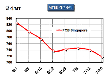 MTBE(Methyl tert-Butyl Ether)는 700달러가 위협받고 있다. MTBE 시세는 7월18일 FOB Singapore 톤당 728달러로 21달러 급락했다. 표, 그래프: <MTBE 가격추이> <화학저널 2018/07/27> |