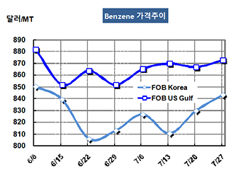벤젠(Benzene)은 의외로 상승세를 계속하고 있다. 벤젠 시세는 7월27일 FOB Korea 톤당 843달러로 13달러 상승했고 FOB SE Asia도 825달러로 14달러 올랐다. CFR China 역시 847달러로 올라섰다. 표, 그래프: <Benzene 가격추이> <화학저널 2018/07/31> |
