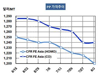 CFR FE Asia 1200달러로 15달러 하락 … 8월 40만톤 신규가동 예정