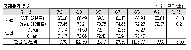 8월9일 국제유가는 미국과 중국의 무역분쟁 심화에 따른 석유 수요 둔화 전망, 중국의 원유 수요 감소, 미국 달러화 강세 등으로 하락했다. 8월9일 국제유가는 미국-중국 무역분쟁으로 석유 수요가 둔화될 것으로 예상됨에 따라 하락했다. 표, 그래프: <국제유가 변화> <화학저널 2018/08/10> |
