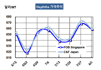 나프타(Naphtha)는 600달러대 중반으로 내려앉았다. 나프타 시세는 8월3일 CFR Japan 톤당 659달러로 14달러 하락했고 FOB Singapore 역시 658달러로 10달러 떨어졌다. CIF NWE는 642달러, FOB US Gulf는 661달러를 형성했다. 표, 그래프: <Naphtha 가격추이> <화학저널 2018/08/10> |
