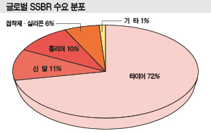 세계 SSBR(Solution Polymerized-Styrene Butadiene Rubber) 시장은 저연비 타이어 보급 확산을 타고 급성장하고 있다.