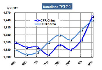 부타디엔(Butadiene)은 급등행진을 계속했다. 부타디엔 시세는 8월10일 FOB Korea 톤당 1740달러로 40달러 급등했으나 CFR SE Asia는 1725달러로 70달러 폭등했다. CFR China 역시 1755달러로 95딜러 폭등했다. 표, 그래프: <Butadiene 가격추이> <화학저널 2018/08/14> |