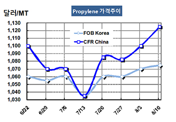 프로필렌(Propylene)은 상승세로 전환됐다. 프로필렌 시세는 8월10일 FOB Korea 톤당 1075달러로 5달러 상승에 그쳤으나 CFR SE Asia는 1025달러로 25달러 올랐다. CFR China도 1125달러로 25달러 상승했다. 표, 그래프: <Propylene 가격추이> <화학저널 2018/08/14> |