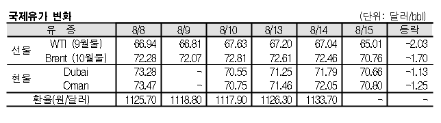 8월15일 국제유가는 미국의 원유 재고 증가, 무역분쟁에 따른 세계경제 둔화 우려 등으로 하락했다. 8월15일 국제유가는 미국의 원유 재고가 증가한 영향으로 하락했다. 표, 그래프: <국제유가 변화> <화학저널 2018/08/16> |