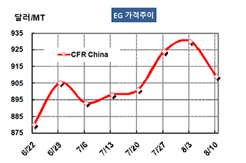 MEG(Monoethylene Glycol)는 하락세로 전화됐다. MEG 시세는 8월10일 CFR China 톤당 909달러로 22달러 하락했고 CFR SE Asia도 939달러로 21달러 떨어졌다. 표, 그래프: <EG 가격추이> <화학저널 2018/08/16> |