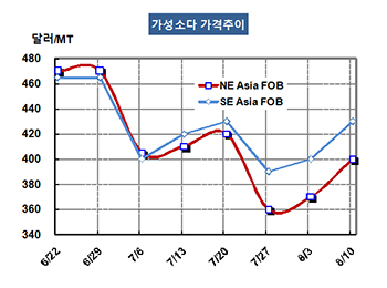 가성소다(Caustic Soda)는 400달러로 올라섰다. 가성소다 시세는 8월7일 FOB NE Asia 톤당 400달러로 30달러 급등했고 CFR SE Asia 역시 430달러로 30달러 올랐다. 표, 그래프: <가성소다 가격추이> <화학저널 2018/08/17> |
