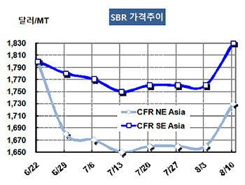 SBR(Styrene Butadiene Rubber)은 갑자기 폭등했다. SBR 시세는 8월10일 CFR NE Asia 톤당 1730달러로 70달러 폭등했고 CFR SE Asia 역시 1830달러로 70달러 올랐다. 표, 그래프: <SBR 가격추이> <화학저널 2018/08/17> |