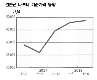 표, 그래프: <일본산 나프타 기준가격 동향> <화학저널 2018/08/17> |