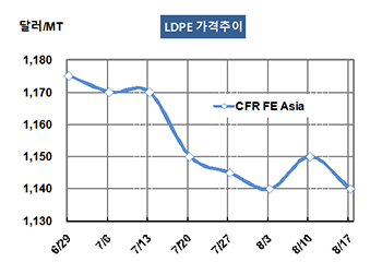 LDPE(Low-Density Polyethylene)는 하락세로 전환됐다. LDPE 시세는 8월15일 CFR FE Asia 톤당 1140달러로 10달러 하락했고 CFR SE Asia도 1160달러로 10달러 떨어졌다. 표, 그래프: <LDPE 가격추이> <화학저널 2018/08/20> |
