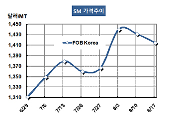 SM(Styrene Monomer)은 하락세로 전환됐다. SM 시세는 8월17일 FOB Korea 톤당 1415달러로 16달러 하락했고 CFR SE Asia도 1455달러로 17달러 떨어졌다. CFR India 역시 17달러 하락해 1459달러를 형성했다. 표, 그래프: <SM 가격추이> <화학저널 2018/08/22> |