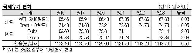 8월23일 국제유가는 미국과 중국의 무역분쟁 심화 우려, 미국의 원유 생산량 증가, 미국 달러화 강세 등으로 하락했다. 8월23일 국제유가는 미국과 중국의 무역분쟁이 심화될 것으로 우려되면서 하락 전환했다 표, 그래프: <국제유가 변화> <화학저널 2018/08/24> |