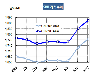 SBR(Styrene Butadiene Rubber)은 또한번 급등했다. SBR 시세는 8월17일 CFR NE Asia 톤당 1775달러로 45달러 급등했고 CFR SE Asia 역시 1875달러로 45달러 올랐다. 표, 그래프: <SBR 가격추이> <화학저널 2018/08/24> |