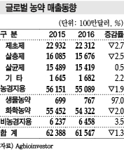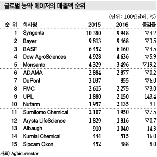 글로벌 농화학 메이저들은 2016년 농약부문 매출이 모두 감소한 것으로 나타났다.