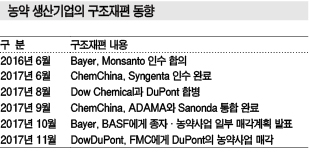 글로벌 농약 시장은 수요가 침체된 가운데 경쟁력 강화를 위한 대규모 사업재편이 잇따르고 있다.