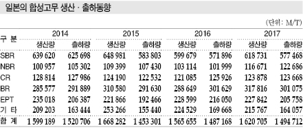 일본은 2017년 합성고무 생산량이 162만706톤으로 전년대비 3.6%, 출하량은 149만4712톤으로 0.7% 증가했다.
