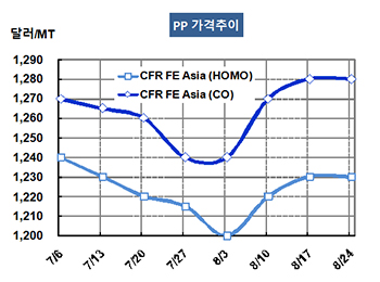 PP(Polypropylene)는 일부 그레이드가 하락했다. PP 시세는 8월22일 Raffia 및 Injection 그레이드가 CFR FE Asia 톤당 1230달러로 5달러 하락했으나 CFR SE Asia는 1245달러 및 1235달러로 변동이 없었다. IPP Film은 FEA가 1240달러, SEA가 1260달러로 보합세를 형성했으나 BOPP는 FEA가 1240달러로 변동이 없었으나 SEA는 1270달러로 5달러 떨어졌다. 표, 그래프: <PP 가격추이> <화학저널 2018/08/28> |
