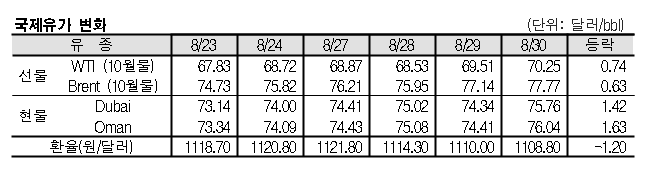 8월30일 국제유가는 미국의 원유 재고 감소 영향이 계속되면서 상승했다. 표, 그래프: <국제유가 변화> |