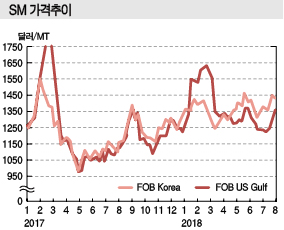 중국이 한국, 타이완, 미국산 SM을 대상으로 잠정 반덤핑관세 부과 판정을 내리면서 최종판정 직전 발생한 반짝 수요도 가격 상승요인으로 작용했다.