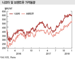 나프타(Naphtha)는 2017년 3월 이후 수급환경이 악화돼 톤당 390달러대까지 떨어졌으나 8월 말 허리케인이 미국 텍사스(Texas) 지역을 강타하면서 상승세로 전환돼 500달러대를 회복했고, 2018년 들어서는 LPG(액화석유가스) 가격 폭락으로 수요가 줄어 550달러를 하회했으나 국제유가 강세를 타고 600달러대 중반으로 올라섰다.