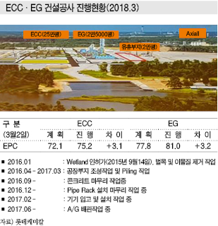 롯데케미칼이 미국 루이지애나(Louisiana)에 건설하고 있는 ECC 및 EG(Ethylene Glycol) 플랜트는 건설공정이 마무리 단계에 들어서 2019년 초 가동할 것으로 예상된다.