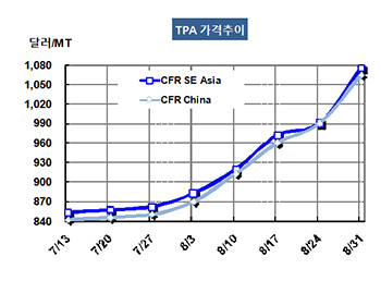 PTA(Purified Terephthalic Acid)가 오랜만에 1000달러를 돌파했다. PTA 시세는 8월31일 CFR China 톤당 1065달러로 75달러 폭등했고 CFR SE Asia 역시 1075달러로 85달러 폭등했다. CFR India는 75달러 폭등해 1078달러를 형성했다. 표, 그래프: <TPA 가격추이> <화학저널 2018/09/06> |
