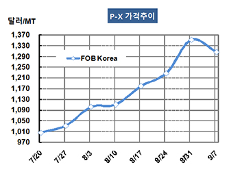 P-X 시세는 9월7일 FOB Korea 톤당 1306달러로 46달러 급락했고 CFR SE Asia도 1313달러로 45달러 떨어졌다. CFR China 역시 45달러 급락해 1326달러를 형성했다. 표, 그래프: <P-X 가격추이> |