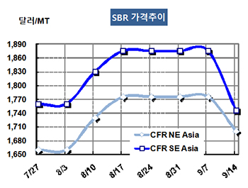 SBR(Styrene Butadiene Rubber)은 폭락세를 면치 못했다. SBR 시세는 9월12일 CFR NE Asia 톤당 1700달러로 75달러 폭락했고 CFR SE Asia는 1745달러로 130달러 대폭락했다. 표, 그래프: <SBRS 가격추이> <화학저널 2018/09/21> |