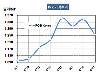 P-X(Para-Xylene)는 폭락세가 불가피했다. P-X 시세는 9월21일 FOB Korea 톤당 1256달러로 88달러 폭락했고 CFR SE Asia도 1263달러로 87달러 폭락했다. CFR China 역시 1276달러로 87달러 폭락했다. 표, 그래프: <P-X 가격추이> <화학저널 2018/09/28> |