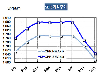 SBR(Styrene Butadiene Rubber)은 폭락세를 계속했다. SBR 시세는 9월19일 CFR NE Asia 톤당 1600달러로 100달러 폭락했고 CFR SE Asia 역시 1645달러로 100달러 폭락했다. 표, 그래프: <SBR 가격추이> <화학저널 2018/09/28> |