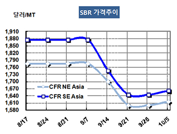 SBR 시세는 10월5일 CFR NE Asia 톤당 1615달러로 15달러 상승했고 CFR SE Asia도 1660달러로 15달러 올랐다. 표, 그래프: <SBR 가격추이> <화학저널 2018/10/12> |