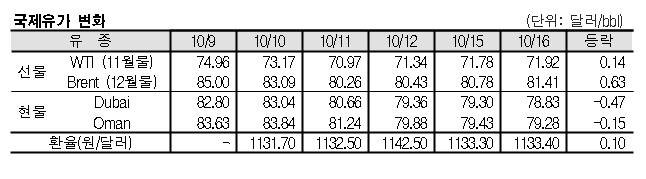 10월16일 국제유가는 이란산 원유 수출 감소 지속, 미국-사우디 간 긴장 우려, 미국 석유협회의 원유 재고 감소 전망, 미국 달러화 약세 등의 영향으로 상승했다.