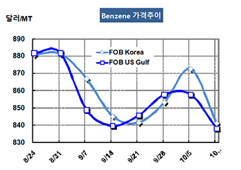 벤젠(Benzene)은 급락현상이 나타났다. 벤젠 시세는 10월12일 FOB Korea 톤당 841달러로 32달러 급락했고 FOB SE Asia도 830달러로 30달러 떨어졌다. 다만, CFR China는 856달러로 19달러 하락에 그쳤다. 표, 그래프: <Benzene 가격추이> <화학저널 2018/10/17> |