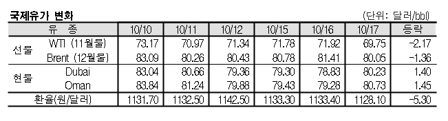 10월17일 국제유가는 미국의 원유 재고 증가, 미국 달러화 강세 등의 영향으로 하락했다.