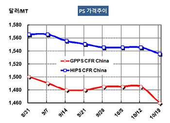 PS(Polystyrene)는 하락세를 다시 시작했다. GPPS(General Purpose PS) 시세는 10월17일 CFR China 톤당 1460달러로 25달러 하락했고 CFR SE Asia는 1535달러로 보합세를 형성했다. 표, 그래프: <PS 가격추이> <화학저널 2018/10/24> |