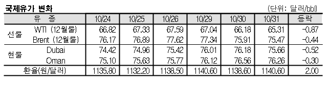 10월31일 국제유가는 미국의 원유 재고 및 생산량 증가, 러시아와 사우디의 석유 생산량 증가, 미국 달러화 강세 등의 영향으로 하락했다. 10월31일 국제유가는 미국의 원유 재고 및 생산량이 증가한 영향으로 하락했다. 표, 그래프: <국제유가 변화> <화학저널 2018/11/01> |