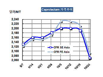 CPL(Caprolactam)은 갑자기 폭락세로 전환됐다. CPL 시세는 10월24일 CFR FE Asia 톤당 2090달러로 120달러 폭락했고 CFR SE Asia 역시 2070달러로 120달러 폭락했다. 표, 그래프: <Caprolactam 가격추이> <화학저널 2018/11/01> |