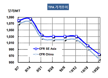PTA(Purified Terephthalic Acid)는 1000달러가 무너졌다. PTA 시세는 10월24일 CFR China 톤당 975달러로 27달러 하락했고 CFR SE Asia도 980달러로 24달러 떨어졌다. 표, 그래프: <TPA 가격추이> <화학저널 2018/11/01> |