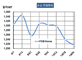 P-X(Para-Xylene)는 1200달러가 위험해지고 있다. P-X 시세는 10월26일 FOB Korea 톤당 1214달러로 25달러 하락했고 CFR SE Asia도 1221달러로 24달러 떨어졌다. 표, 그래프: <P-X 가격추이> <화학저널 2018/11/01> |