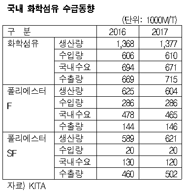 국내 폴리에스터(Polyester) 사 생산 기반이 위태로워지고 있다. 표, 그래프: <국내 화학섬유 수급동향> <화학저널 2018/11/01> |
