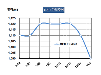 LDPE 시세는 10월31일 CFR FE Asia 톤당 1090달러로 20달러 하락했고 CFR SE Asia도 1130달러로 10달러 떨어졌다.