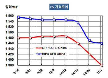 GPPS(General Purpose PS) 시세는 10월31일 CFR China 톤당 1380달러로 40달러 폭락했고 CFR SE Asia도 1430달러로 40달러 폭락했다.