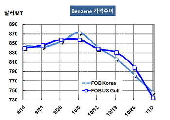 벤젠(Benzene)은 700달러대 중반으로 내려앉았다. 벤젠 시세는 11월2일 FOB Korea 톤당 746달러로 37달러 급락했고 FOB SE Asia도 729달러로 43달러 폭락했다. CFR China 역시 43달러 폭락해 761달러를 형성했다. 표, 그래프: <Benzene 가격추이> <화학저널 2018/11/07> |