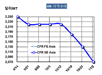 AN(Acrylonitrile)은 급락세가 계속됐다. AN 시세는 10월31일 CFR FE Asia 톤당 2070달러로 60달러 급락했고 CFR SE Asia 역시 2070달러로 60달러 급락했다. 표, 그래프: <AN 가격추이> <화학저널 2018/11/08> |