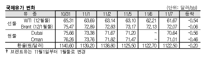 11월7일 국제유가는 미국의 원유 재고 및 생산량 증가, 이란의 석유 공급량 감소 우려 완화 등의 영향으로 하락했다. 11월7일 국제유가는 미국의 원유 재고 및 생산량이 증가한 영향으로 하락했다. 표, 그래프: <국제유가 변화> <화학저널 2018/11/08> |
