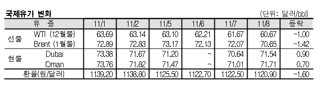 11월8일 국제유가는 미국 등의 석유 공급 증가 가능성, 이란의 공급차질 우려 완화, 미국 달러화 강세 등의 영향으로 하락했다. 11월8일 국제유가는 미국 등의 석유 공급이 증가할 가능성이 제기됨에 따라 하락했다. 표, 그래프: <국제유가 변화> <화학저널 2018/11/09> |