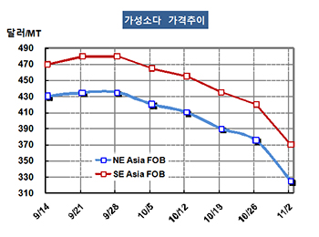 가성소다(Caustic Soda)는 300달러대 초반으로 폭락했다. 가성소다 시세는 10월31일 FOB NE Asia 톤당 325달러로 50달러 폭락했고 CFR SE Asia도 370달러로 50달러 폭락했다. 표, 그래프: <가성소다 가격추이> <화학저널 2018/11/09> |