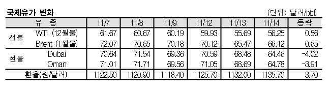 11월14일 국제유가는 감산 참여국의 감산 논의, 미국 달러화 약세 등의 영향으로 상승했다. 11월14일 국제유가는 감산 참여국의 감산 논의 영향으로 상승했다. 표, 그래프: <국제유가 변화> <화학저널 2018/11/15> |