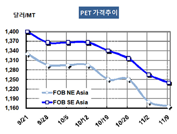 PET(Polyethylene Terephthalate)는 하락세가 둔화되고 있다. PET 시세는 11월7일 Bottle 그레이드 기준 FOB NE Asia 톤당 1165달러로 15달러 하락했고 FOB SE Asia는 1240달러로 25달러 떨어졌다. 표, 그래프: <PET 가격추이> <화학저널 2018/11/15> |